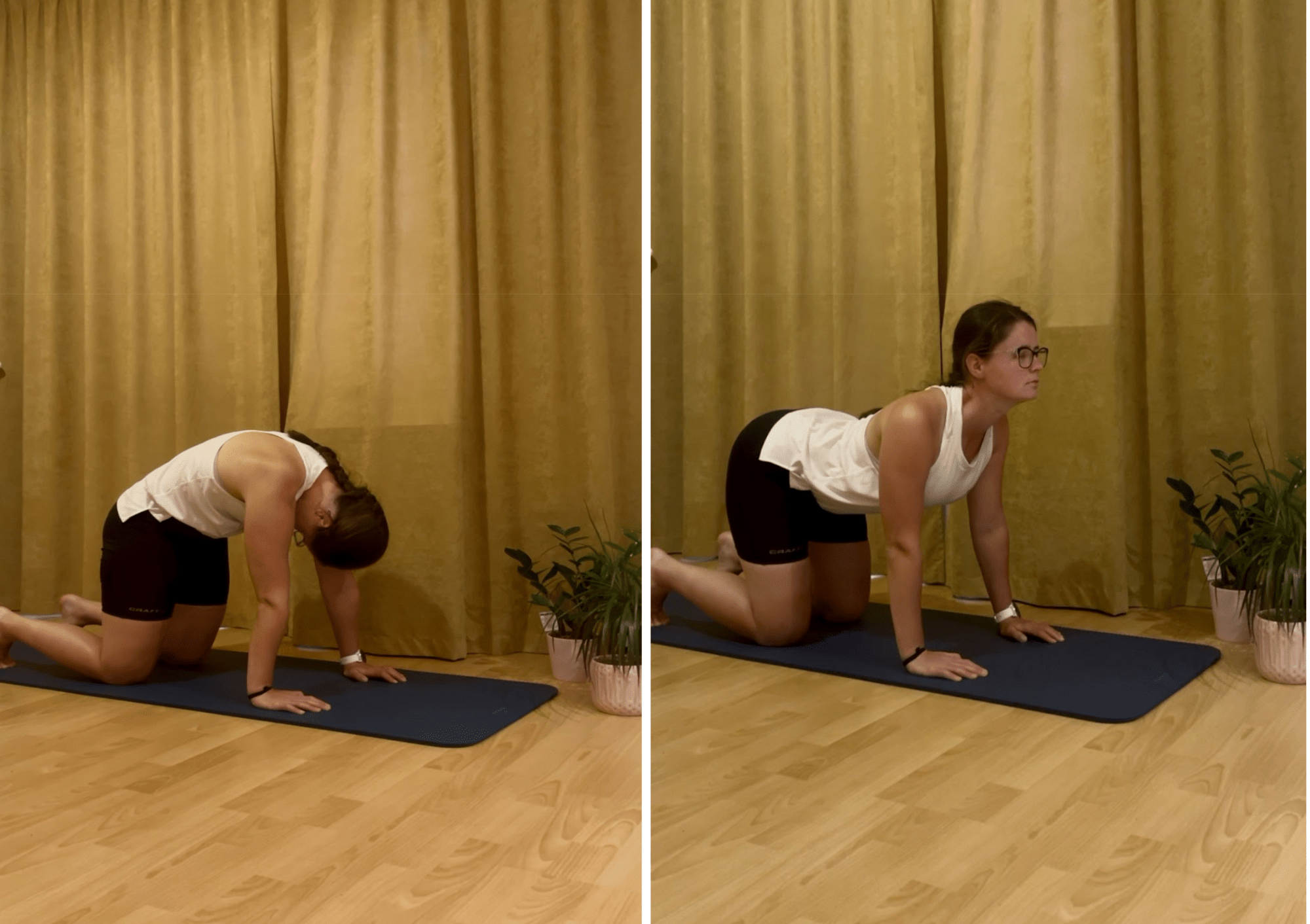 - Cat-cow – kočičí záda, mobilizuje páteř a trup. Na čtyřech střídavě vyhrbuj a prohýbej záda.
