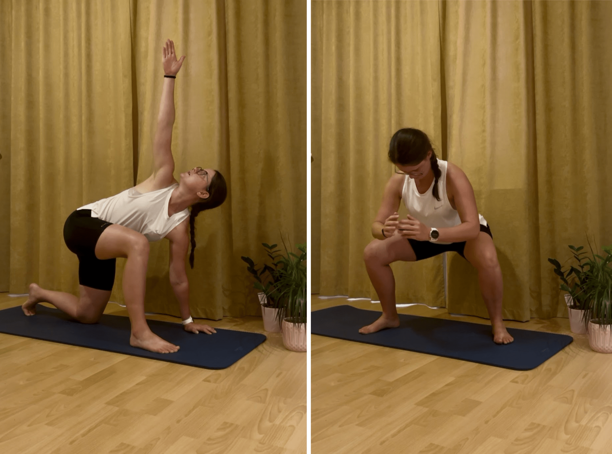 - Výpad s rotací – mobilizuje bedra a hrudní páteř. Začni ve výpadu, jednu ruku opírej o podložku a druhou rotuj trup směrem nahoru, sleduj dlaň pohledem.