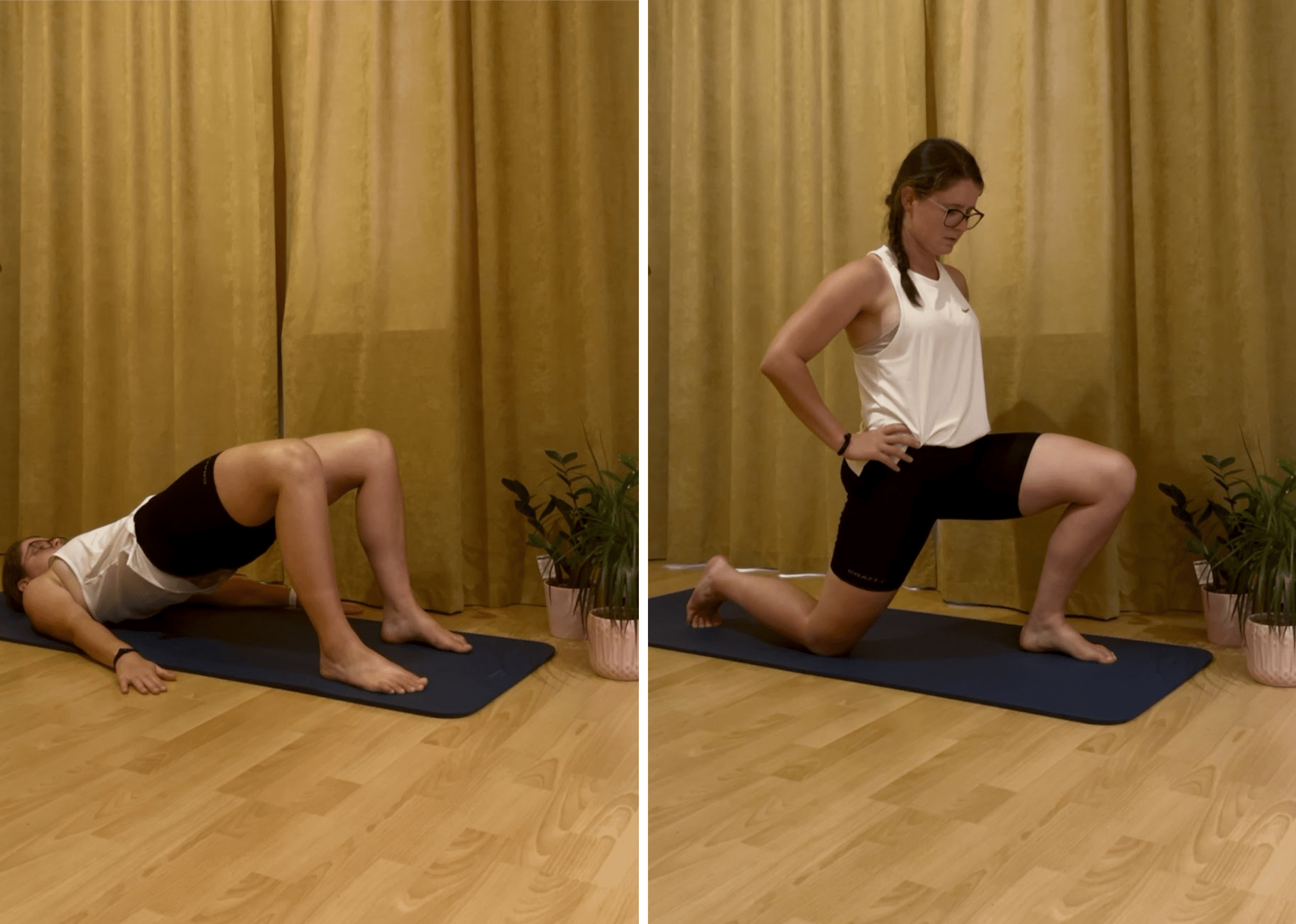 - Hip flexor stretch – výpad vpřed, zadní noha pokrčená na koleně, přední do 90°, pánev jemně zatlač dopředu.