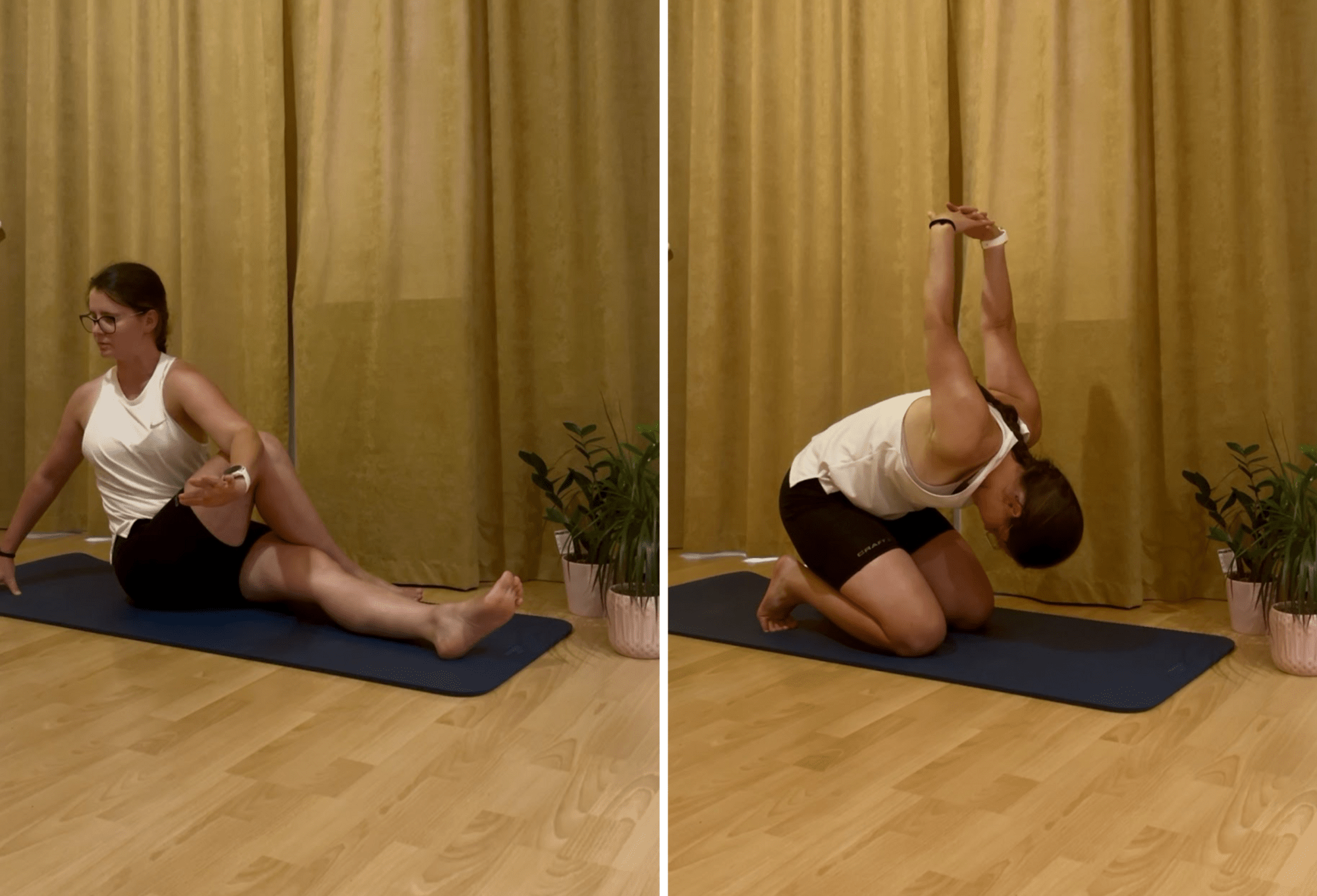 - Glute stretch – sedni si, pokrč jednu nohu přes druhou, trup jemně otoč směrem k pokrčené noze.