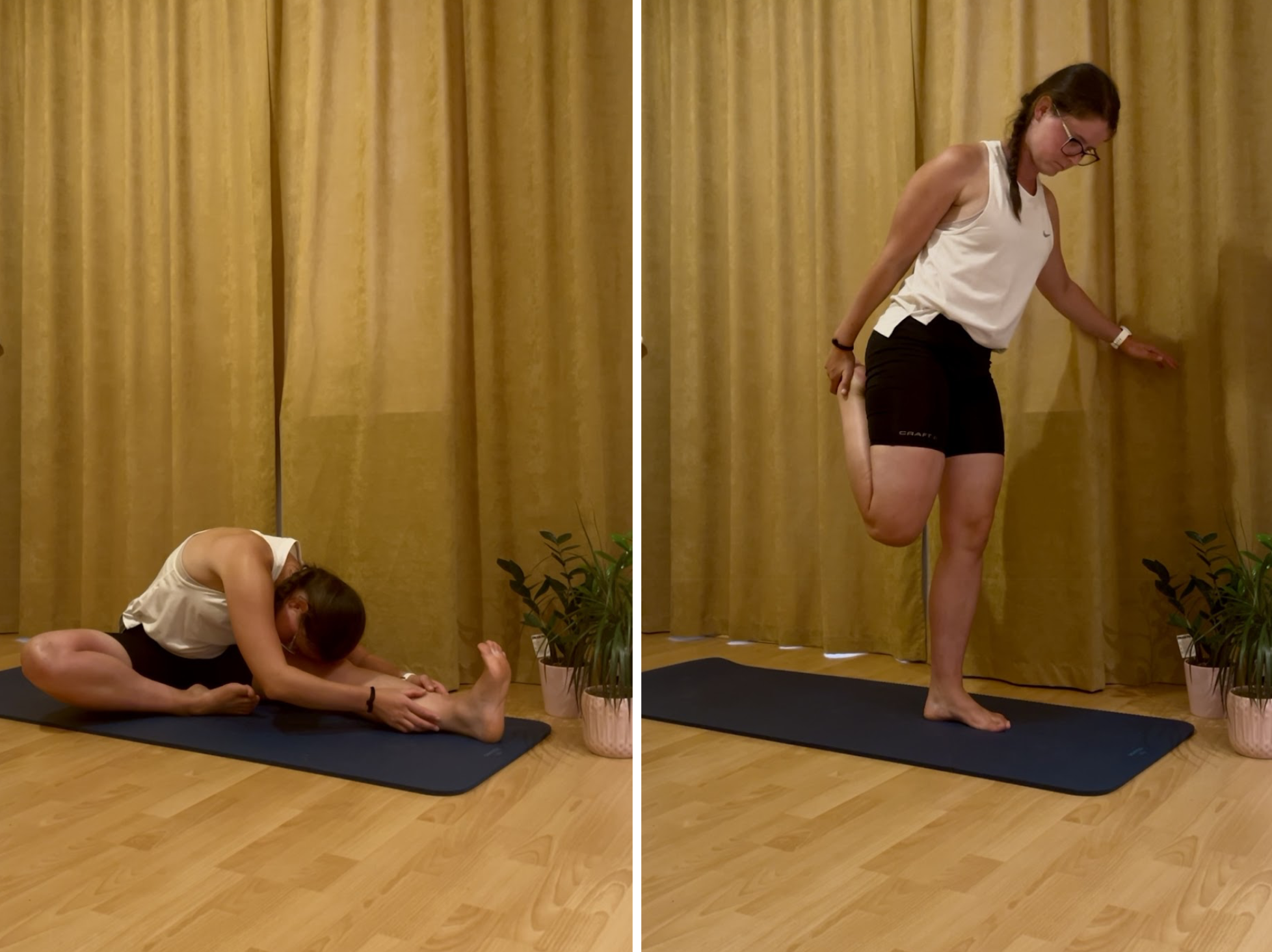 - Hamstring stretch – sed nebo noha na lavičce, trup vzpřímeně, nakláněj se k noze 20–30 sekund.