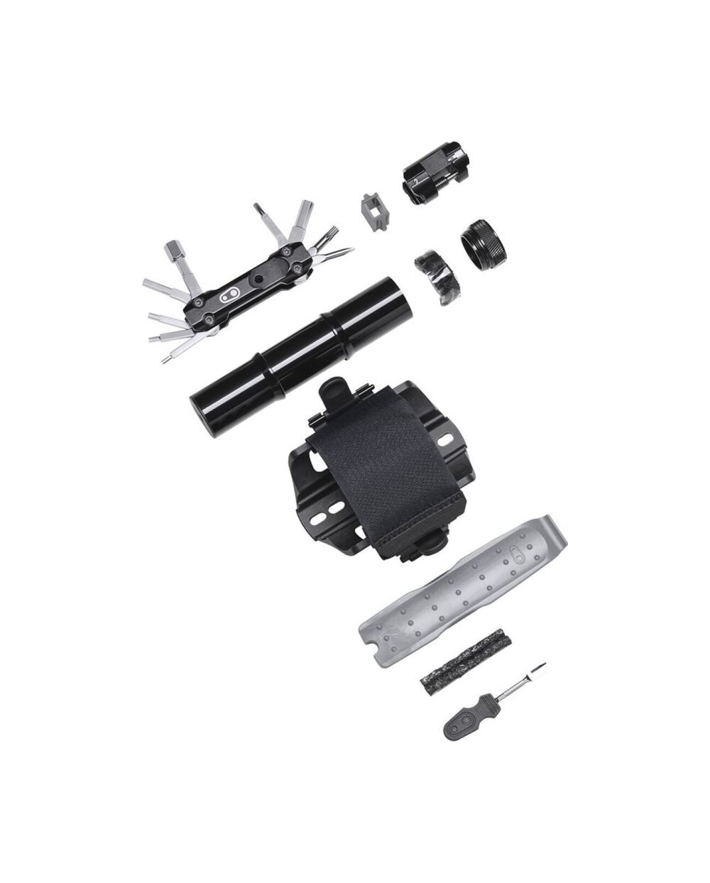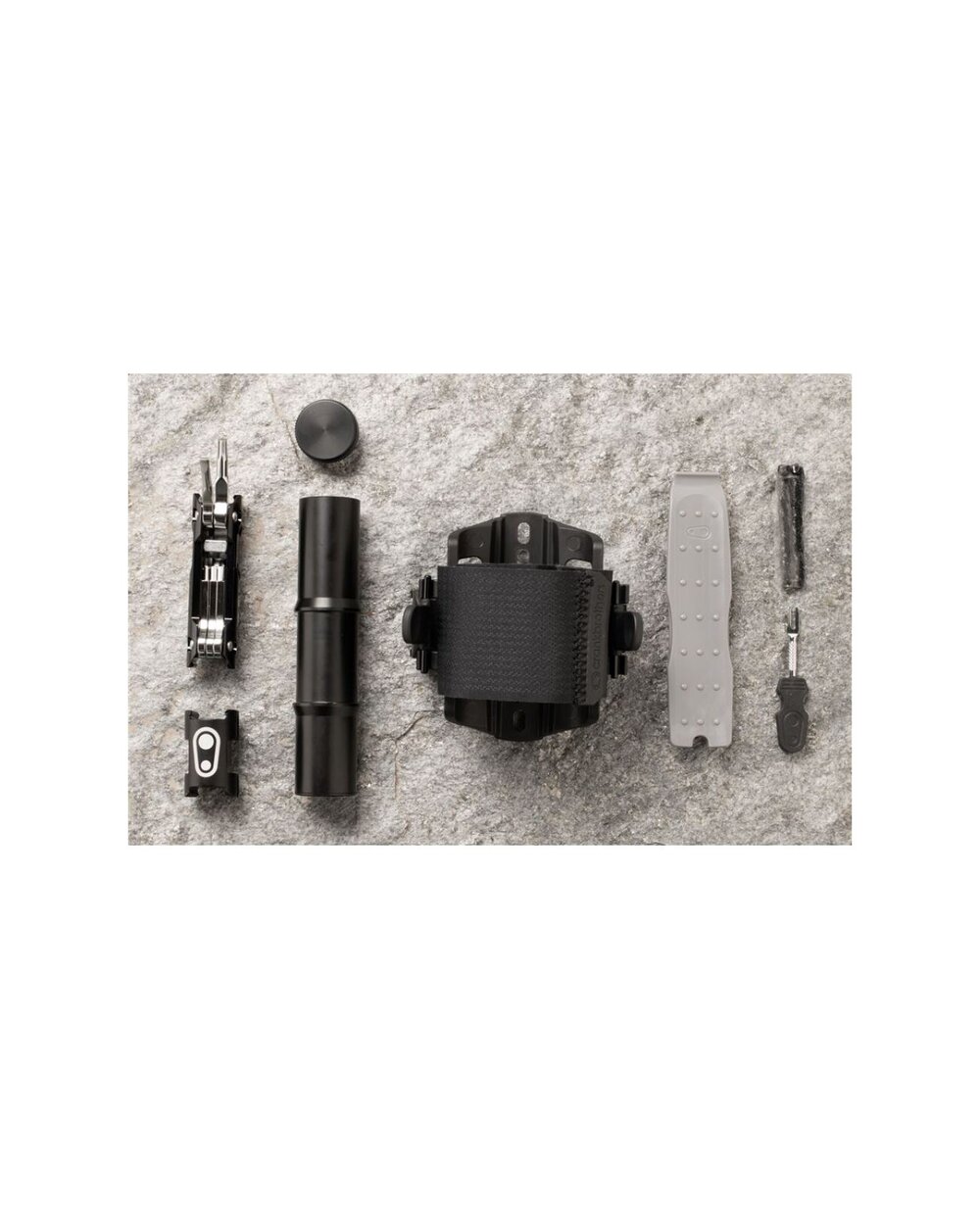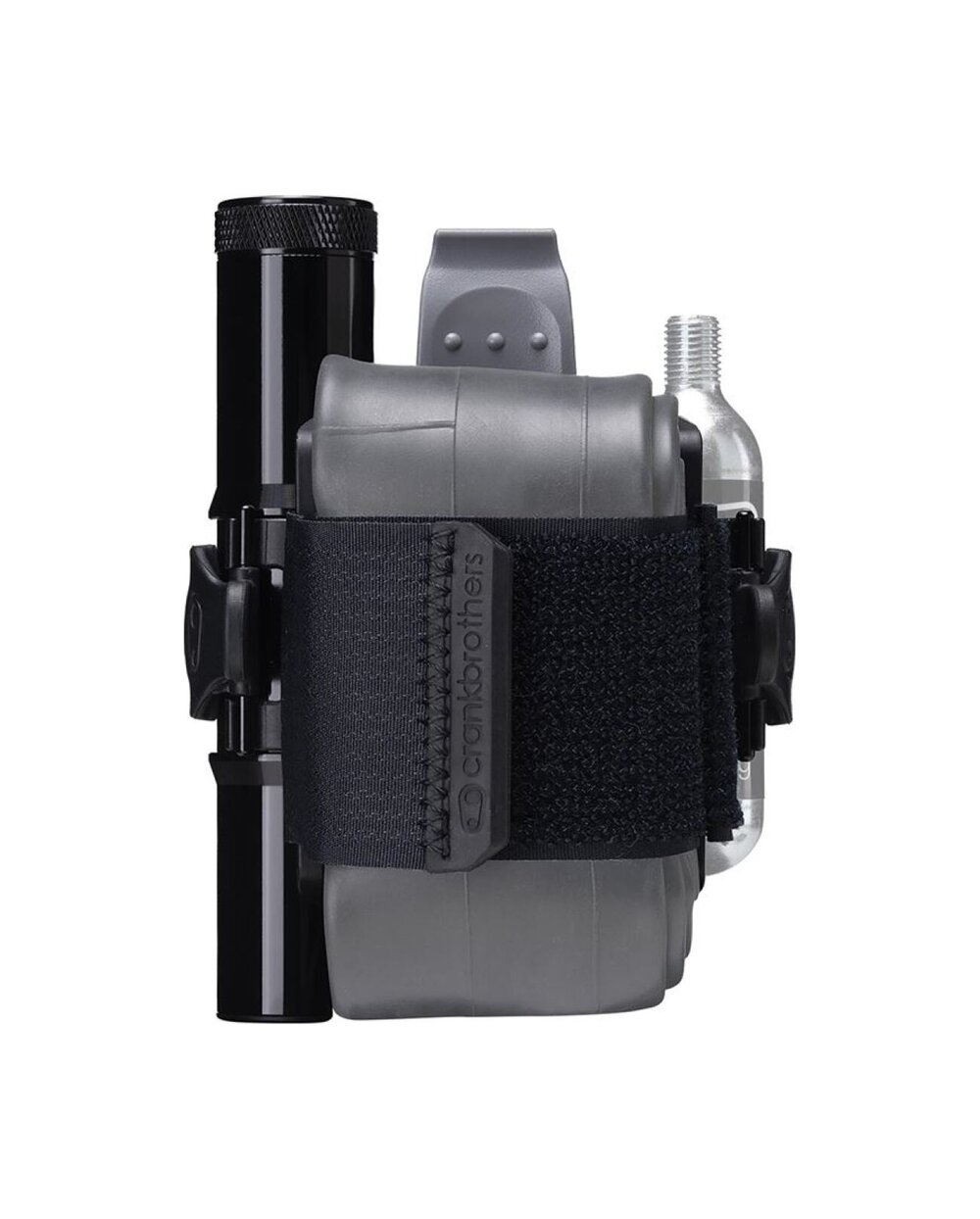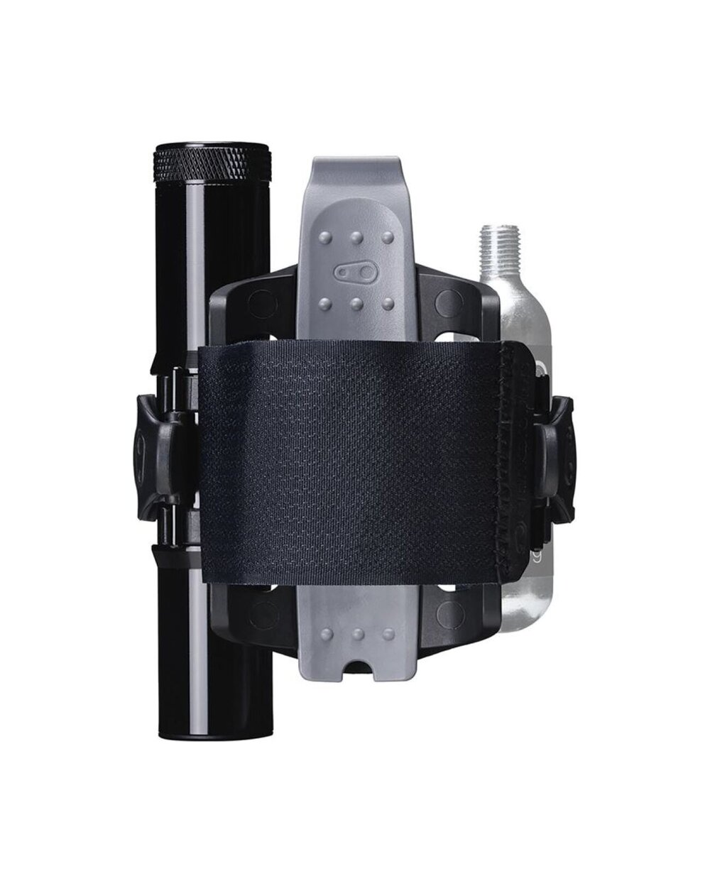 Držák náhradní duše nebo dalšího vybavení s páskem na suchý zip. Montáž místo košíku. V bočním úložném prostoru našlo místo velké multifunkční nářadí a na druhou stranu košíku je možné připnout CO2 bombičku nebo minipumpu.