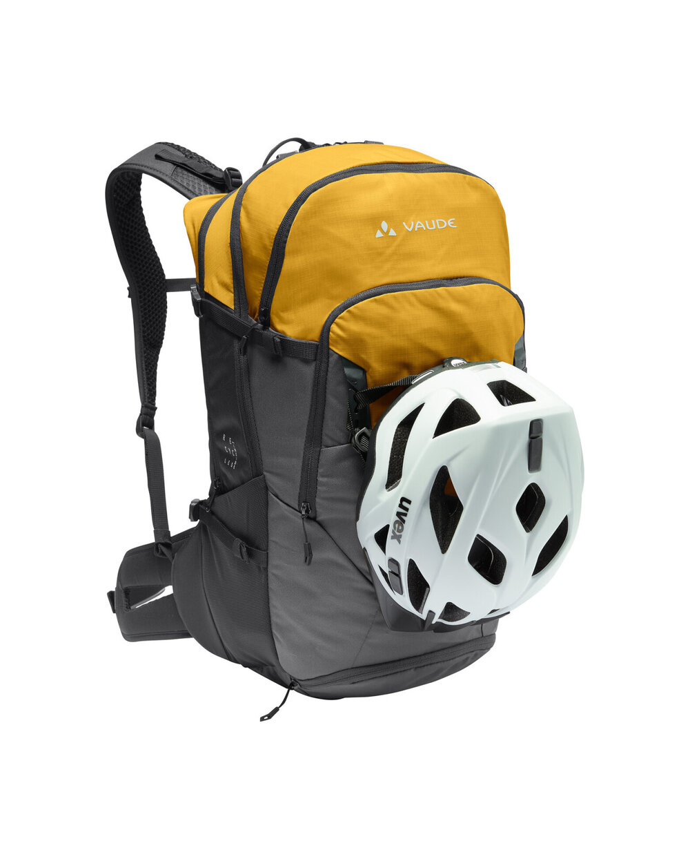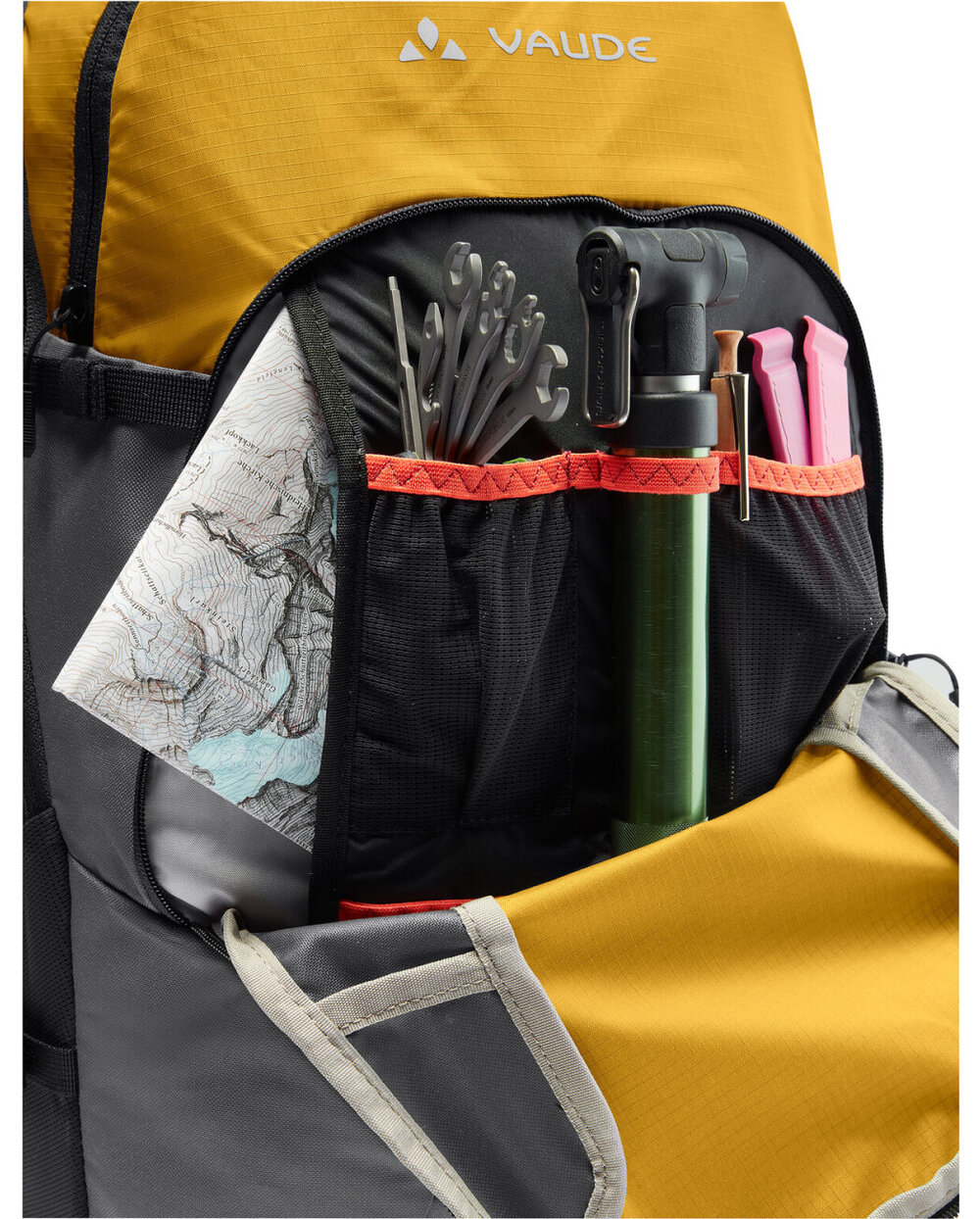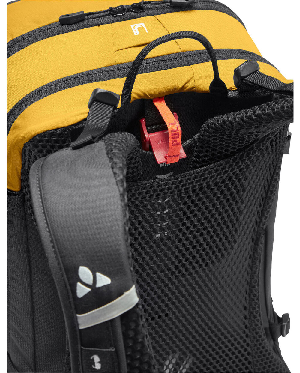 - Přední komora, horní kapsa s organizátorem sítě, velký přední kompartment oddělený od menších bočních vnějších kapes, přilby a držáku světla, zahrnuje pláštěnku