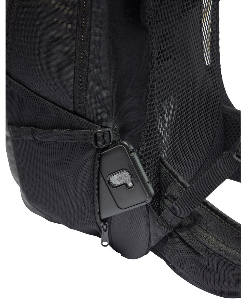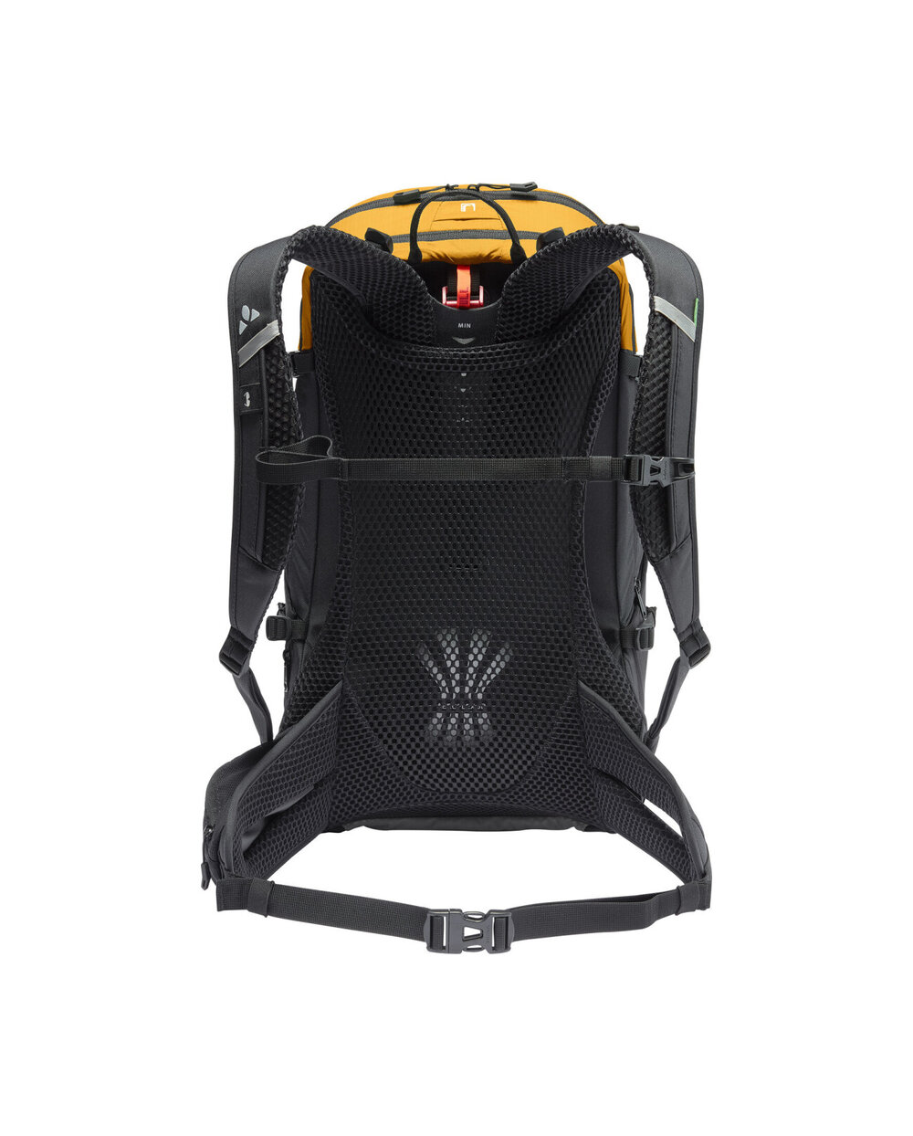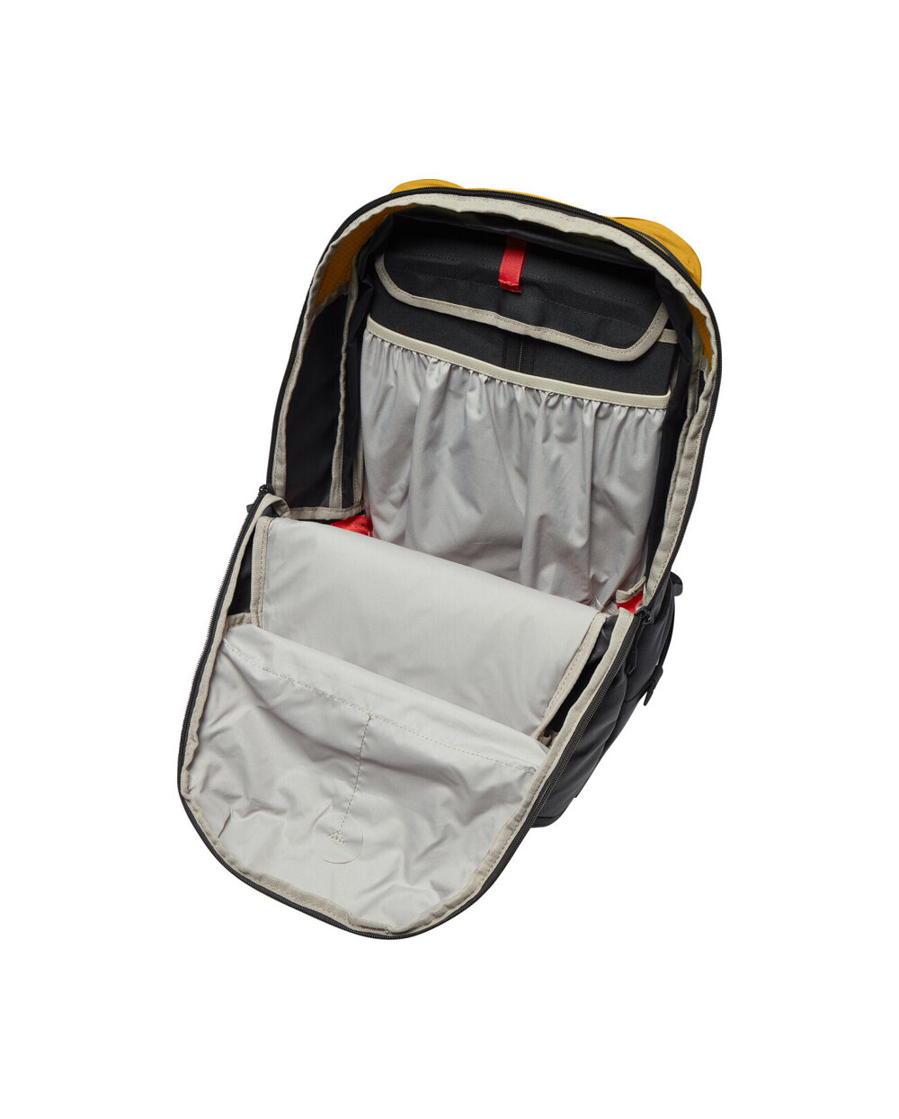 - Přední komora, horní kapsa s organizátorem sítě, velký přední kompartment oddělený od menších bočních vnějších kapes, přilby a držáku světla, zahrnuje pláštěnku