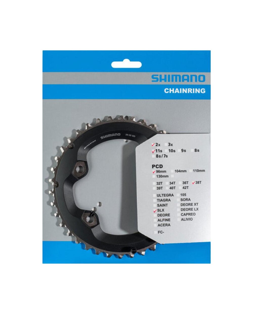 Typ: MTB, Celková hmotnost balení: 135 g, Počet zubů na přehazovačce: 38, Přehazovačka: 11 rychlostí, Pro kombinace přehazovaček: 38/28, Počet převodů: 2x11, Rozteč přehazovaček: 96 mm, černá barva.
