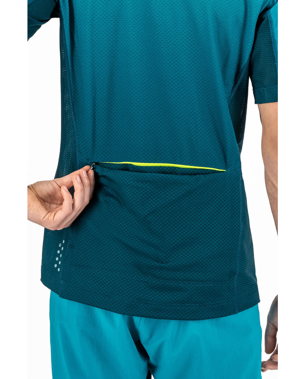 Letní MTB dres s kratšími rukávy Verve carpos je vyroben z dvojice funkčních materiálů, které poskytují optimální pohodlí i při celodenním používání. Na přední straně je měkký, elastický materiál, který spolu s úzkým střihem zajišťuje přiléhavé nošení. Lepšíšodvodá potu od pokožky (i při nošeníá batohu) zajišťuje perforovanýý materiálá na pažíchá a zádech.