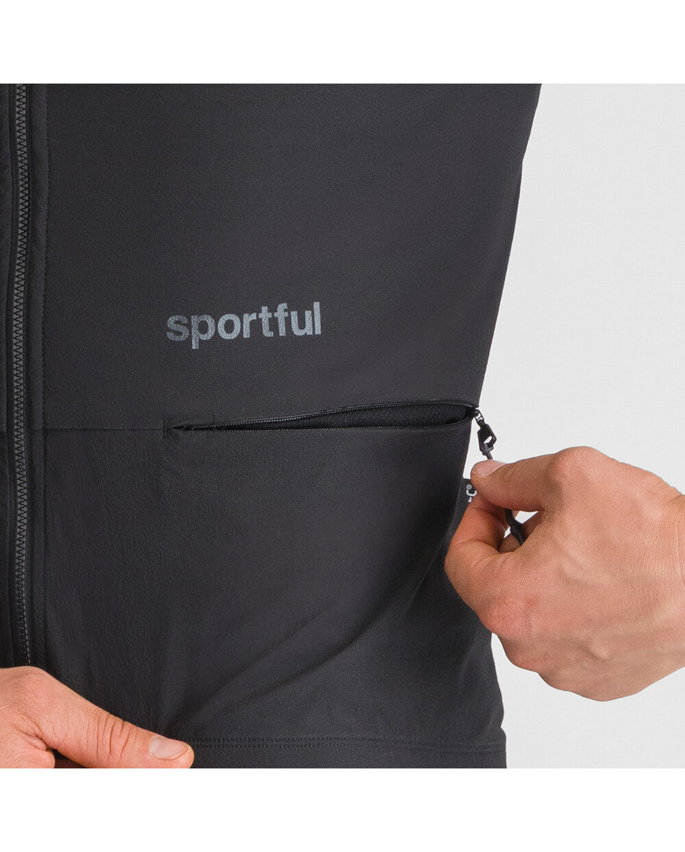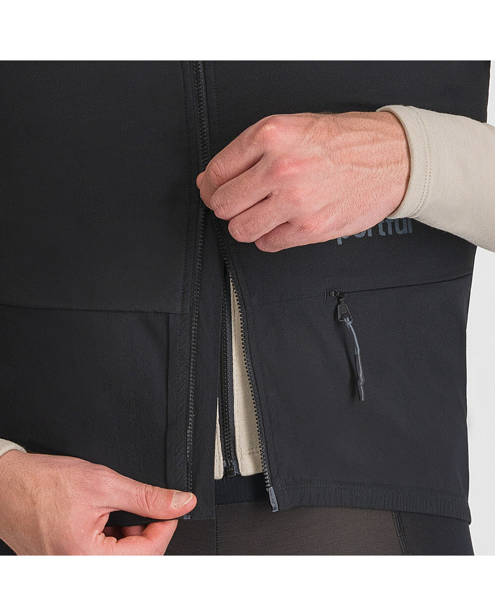 Dvoucestný YKK zip s vnitřní légou – možnost otevřít vestu shora i zdola pro přesnou ventilaci.