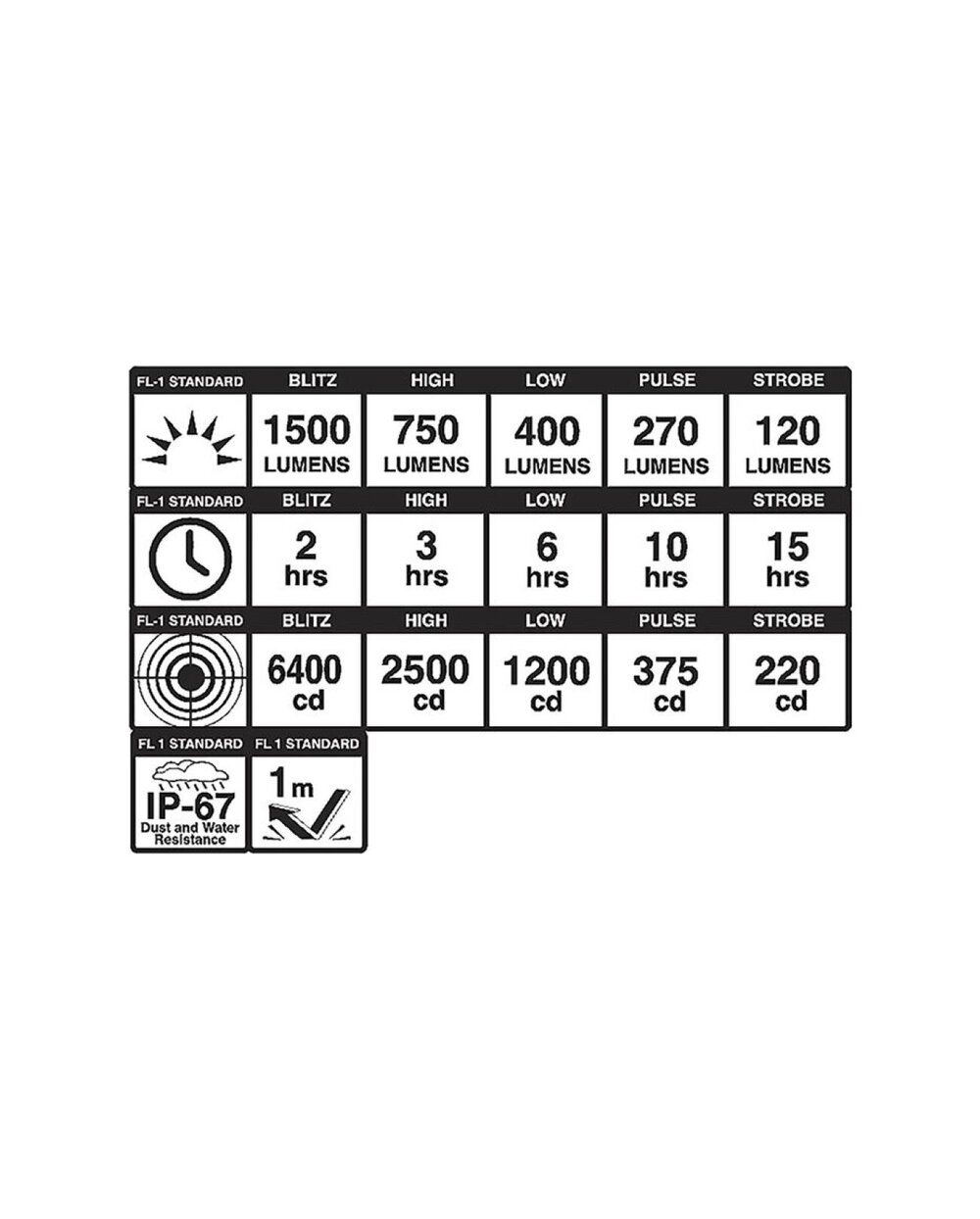 MÓDY Blitz 1500 lumenů/2 h, High 750 lumenů/3 h, Low 400 lumenů/6 h, Pulse 270 lumenů/10 h, Strobe 120 lumenů/15 h