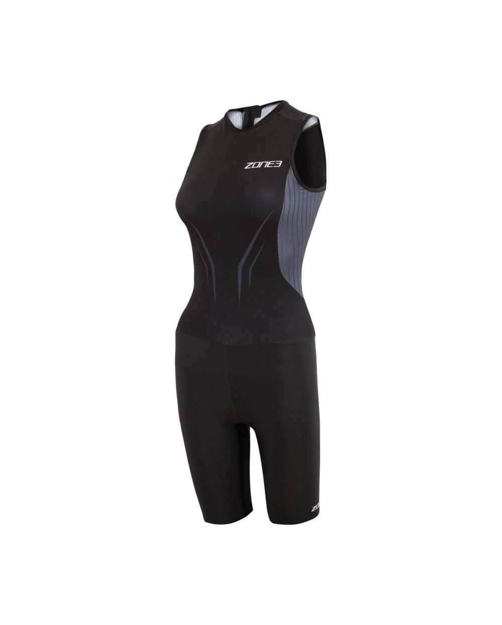 Tato triko bez rukávů má laserem řezané otvory s lehkými silikonovými úchyty, které oblek pevně drží na místě bez zbytečných švů, zvyšují pohodlí a snižují odpor vzduchu. Integrovaný zadní pružný zip umožňuje snadné oblékání a optimální pozici během cyklistické části. Aerodynamicky navržená pouzdra na výživu poskytují prostor pro gely bez ovlivnění výkonu. Kombinéza je doplněna vysoce výkonnou vložkou (podložkou) speciálně navrženou pro triatlon, která poskytuje pohodlí jak při cyklistice, tak při běhu.