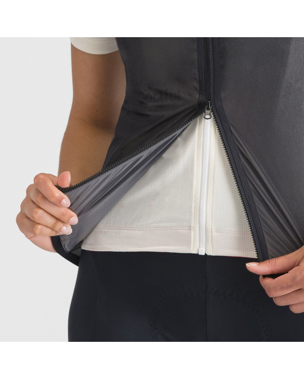Zip s dvojitým jezdcem vám umožní větrání zespodu bez nutnosti jeho úplného rozepnutí – praktické zejména na kopcích, kde potřebujete ochladit jádro těla bez ztráty aerodynamiky.
